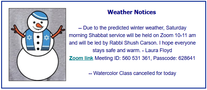 - Shabbat morning Traditional services: 9:45 am, 1st and 3rd Saturdays in the month, led by the Rabbi and Religious Services Committee or Rabbi Rosenbaum (in-person and zoom)