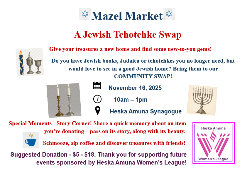 Please drop your items off in Room 118 at Heska Amuna Women’s League, request a pick-up by emailing Angela at torahlove1971@gmail.com, or donate directly to the Heska Amuna Women’s League account via Venmo address @HAWL2025 and we’ll purchase the items for you. Thank you for joining us in bringing tzedakah to our Knoxville community!